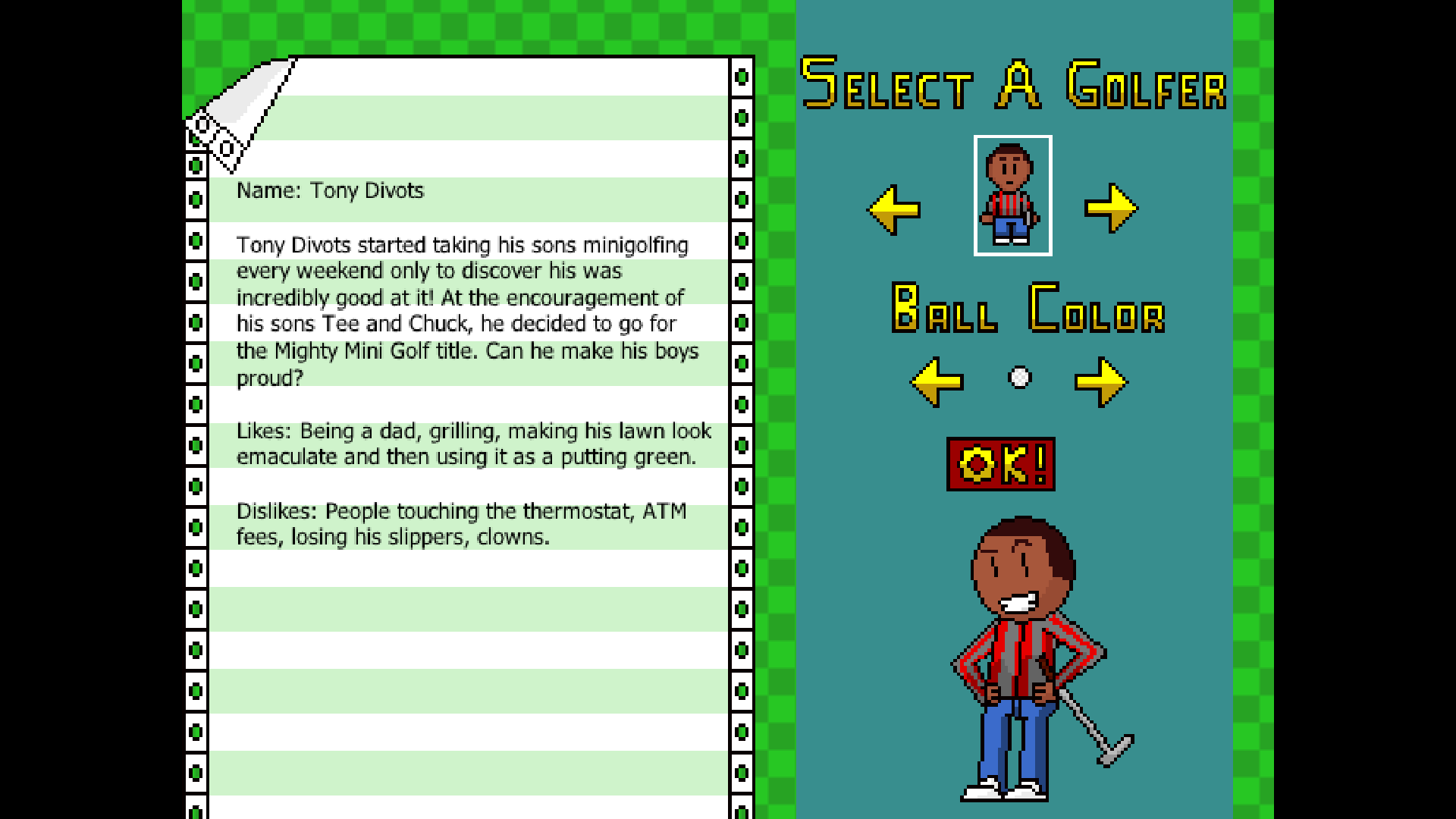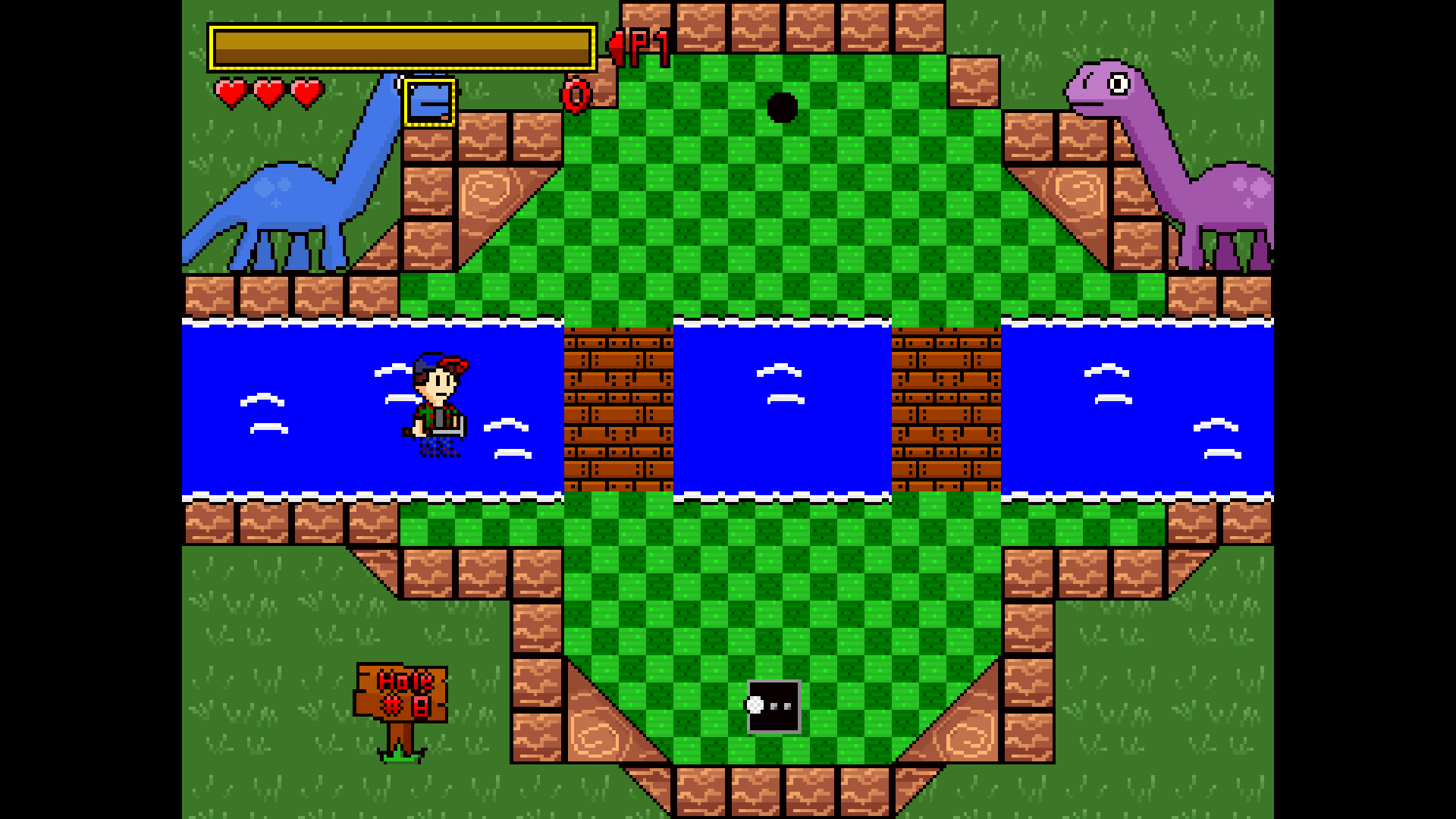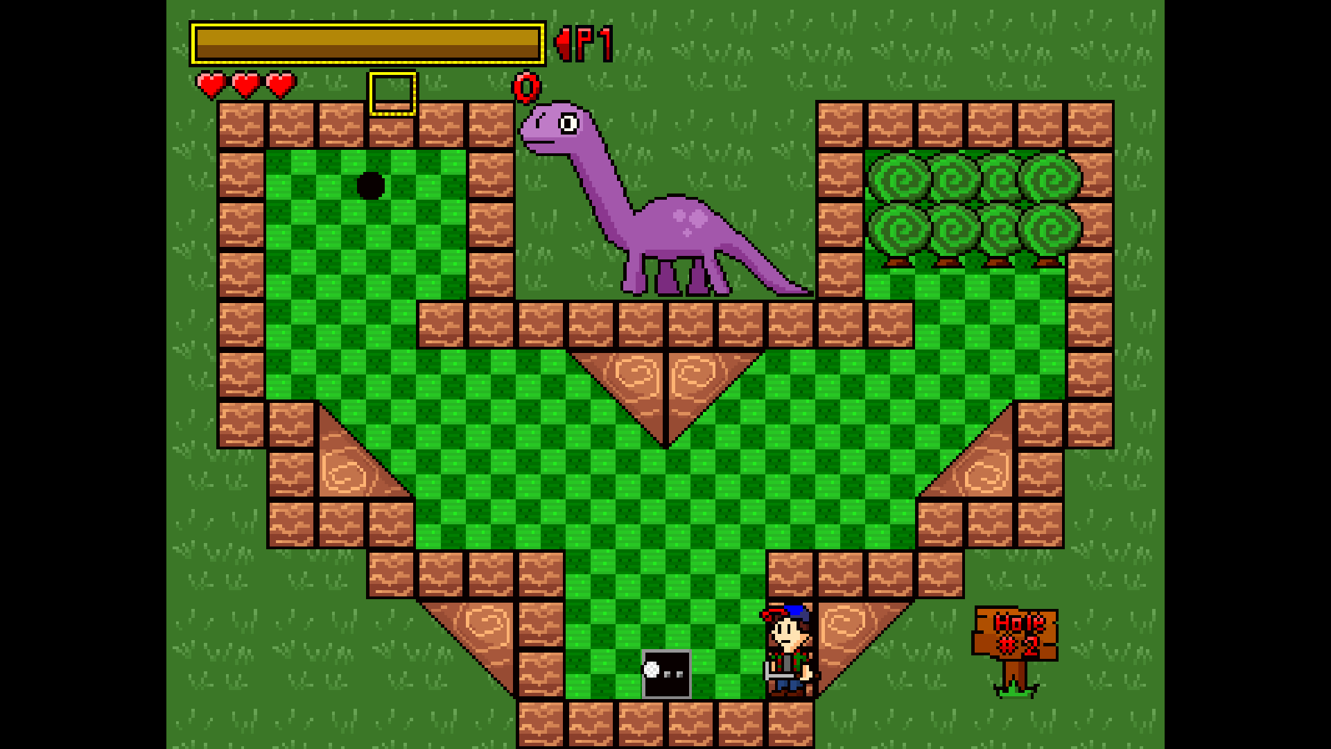 Hey! I made a mini-golf game! Of course a normal mini-golf game wouldn't be terribly interesting, so this one has a few twists up its sleeve. Mighty Mini Golf you control your golfer and approach the ball before and after each stroke. The hazards on the course aren't just for the ball to avoid, either! This is a golf game where death can happen! Run out of health on a hole and you'll take the maximum amount of strokes and move on to the next one. You can take on the course in single player or against a friend in local multiplayer where there are a whole host of wacky items you can use to get the upper hand on your opponent, everything from tossing tomatoes, to smoke bombs, and even a killer bee hive! You can also swing your club to clear bushes and flip switches that effect all sorts of things on the course. Here's the controls since there's no in-game tutorial as of yet: